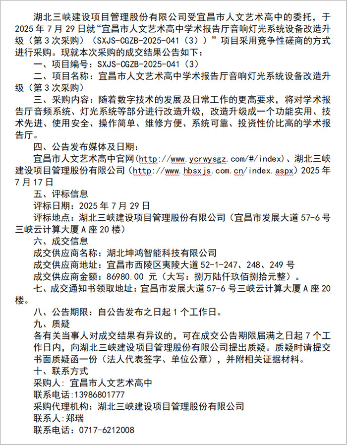 宜昌市人文艺术高中学术报告厅音响灯光系统设备改造升级(第3次采购)成交结果公告