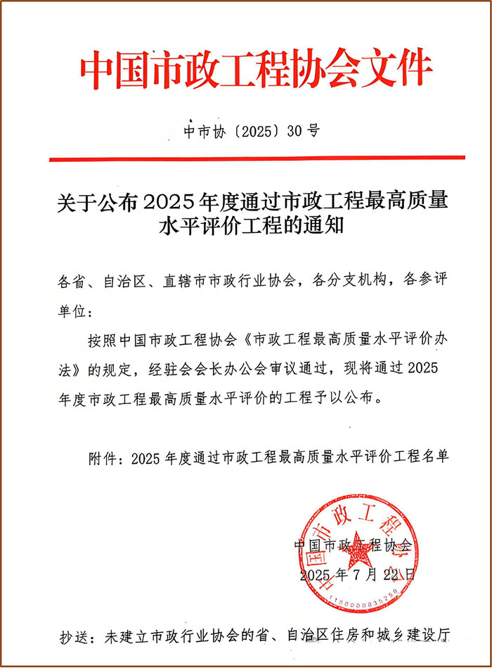 热烈祝贺我公司监理的三峡快速路互通立交-花溪路节点互通工程顺利通过2025年度全国市政工程最高质量水平评价!该奖项由中国市政工程协会组织评选,代表我国市政工程行业质量管理的最高水准,与建筑领域"鲁班奖"齐名,是对项目卓越品质的权威认可。